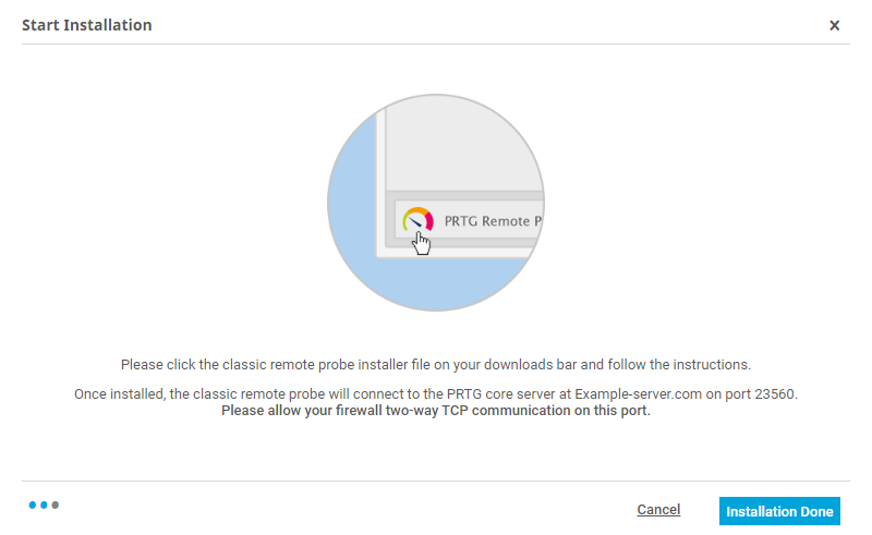 i_round_redBecause remote probes need to connect to your PRTG core server, PRTG needs to accept incoming remote probe connections. So, with PRTG Network Monitor, first prepare your PRTG core server before you install a remote probe.