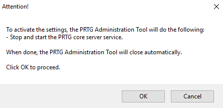 After you change settings, click Save & Close. A new dialog box appears where PRTG asks you to agree to restart the PRTG core server service. Click OK to proceed.