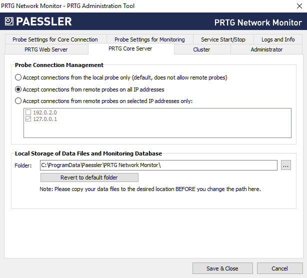 • Accept connections from remote probes on all IP addresses: Accept incoming connections from remote probes, no matter on which IP address of the PRTG core server they come in.