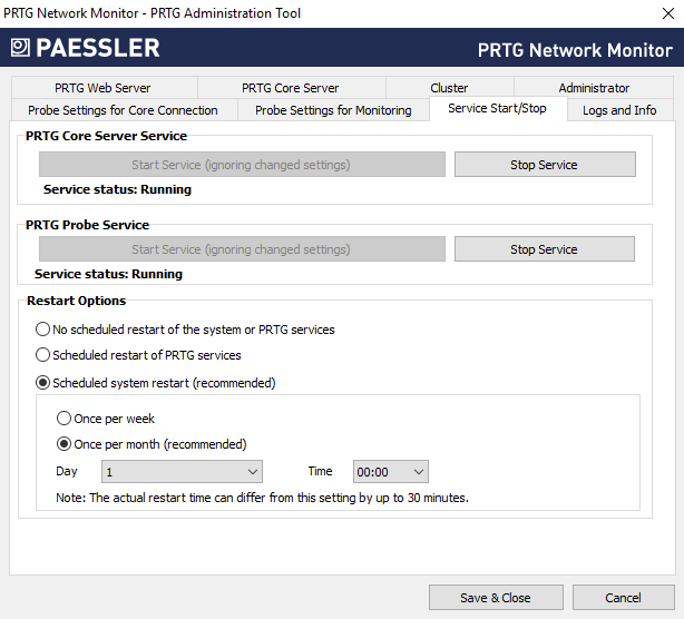 • No scheduled restart of the system or PRTG services: Do not automatically perform a scheduled restart of services. We recommend that you manually restart the PRTG core server system every few weeks. You can also restart the PRTG core server service and PRTG probe service under Administrative Tools in the PRTG web interface.