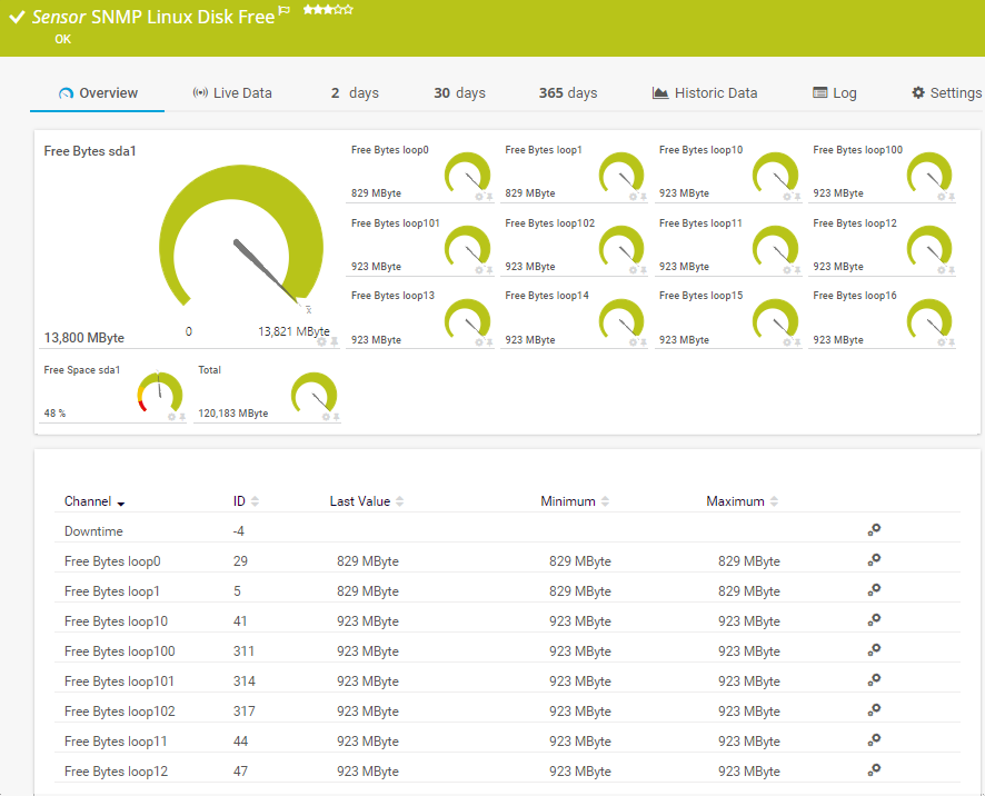 Use the limits of both the sensor and the channel settings: Define limits for the sensor that are valid for all byte size channels. Additional fields appear below. The sensor shows the Warning or Down status when free space limits are above or below the value.